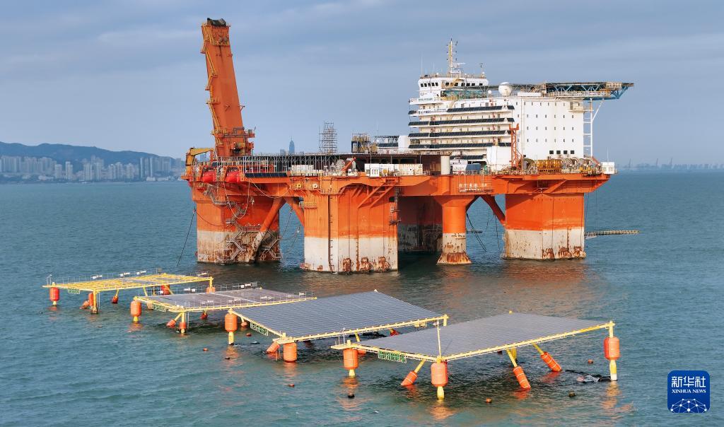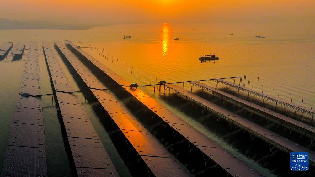 11月19日拍攝的山東煙臺(tái)高新區(qū)海域浮式光伏平臺(tái)和海上光伏實(shí)證基地(無人機(jī)照片)。