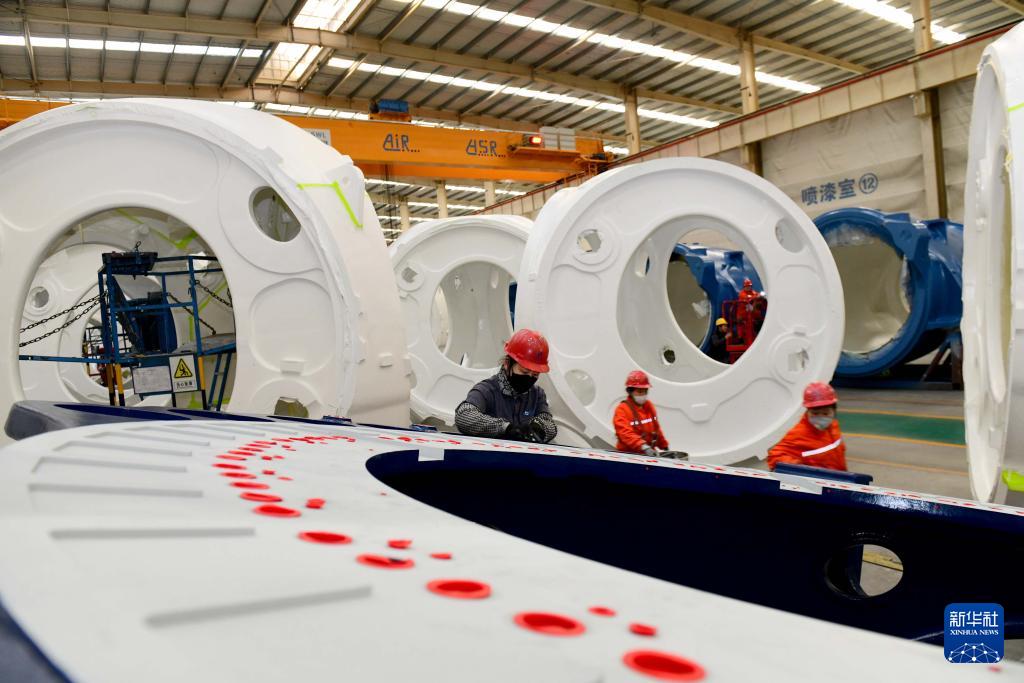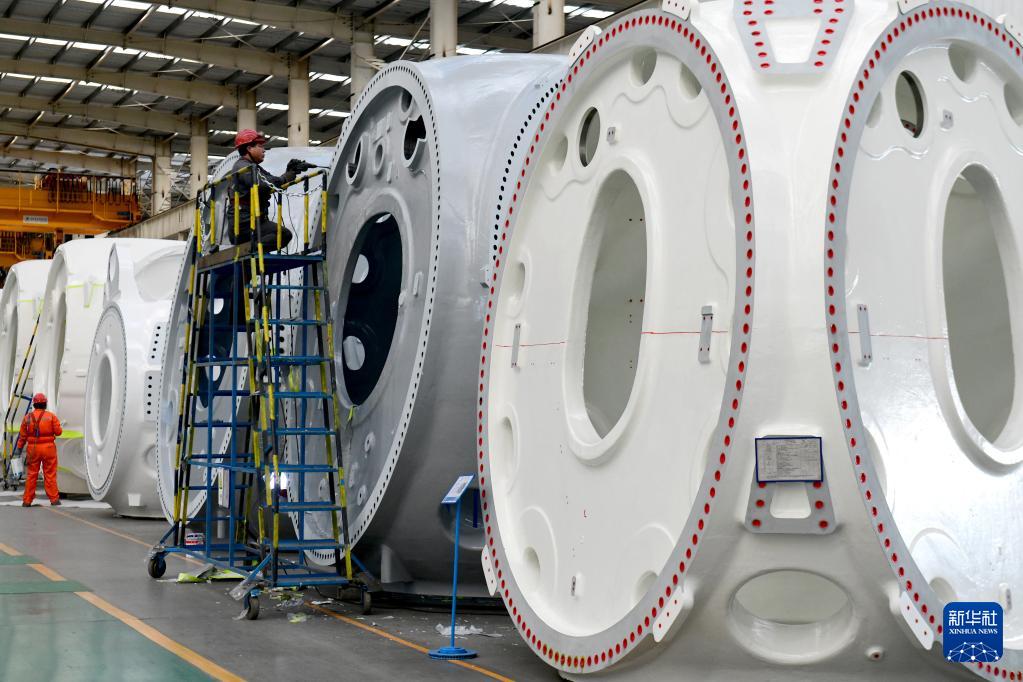 11月19日,在濱州市惠民縣風(fēng)電裝備制造產(chǎn)業(yè)園涂裝車間,工人在涂裝風(fēng)電輪轂。