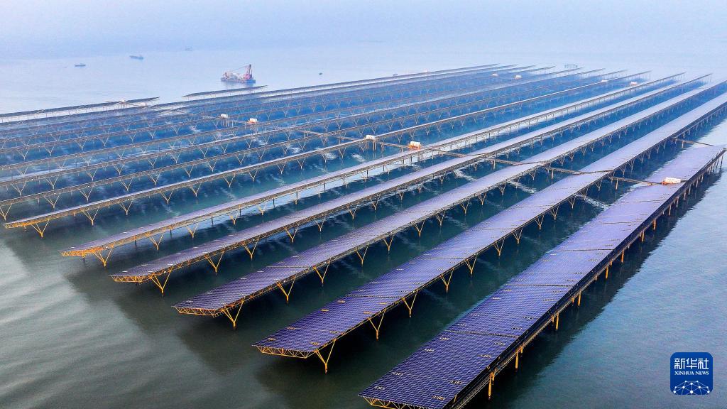 11月16日拍攝的青島市即墨區(qū)鰲山灣海域海上樁基固定式光伏發(fā)電項(xiàng)目(無人機(jī)照片)。