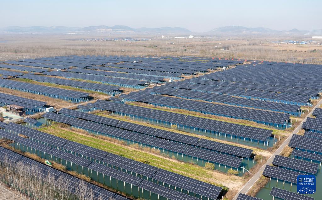 11月18日拍攝的滕州市濱湖鎮(zhèn)煤礦塌陷地“漁光互補(bǔ)”光伏發(fā)電項(xiàng)目(無人機(jī)照片)。