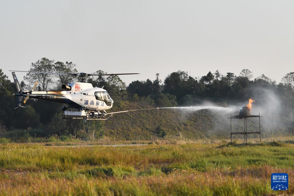 這是11月21日在株洲蘆淞機(jī)場(chǎng)拍攝的直升機(jī)消防演練。