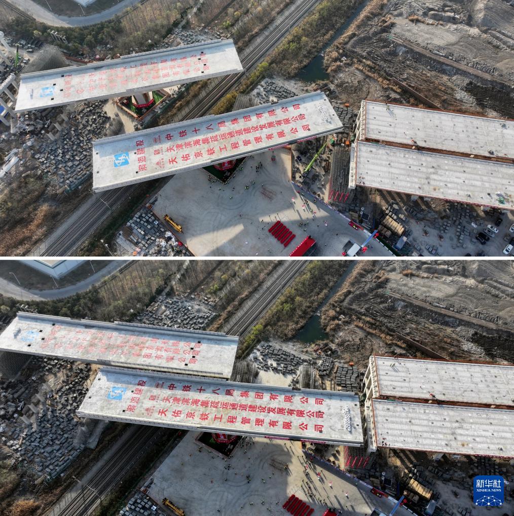 11月26日拍攝的興港高速上跨津山鐵路轉(zhuǎn)體橋施工現(xiàn)場(拼版照片,無人機照片)。