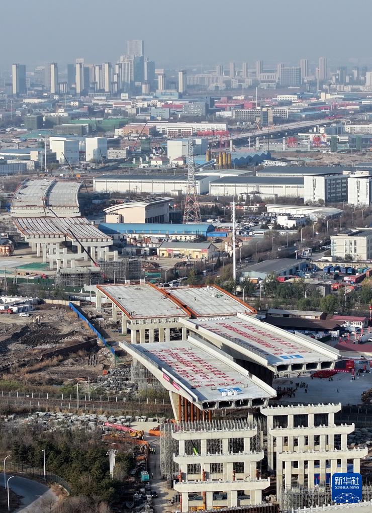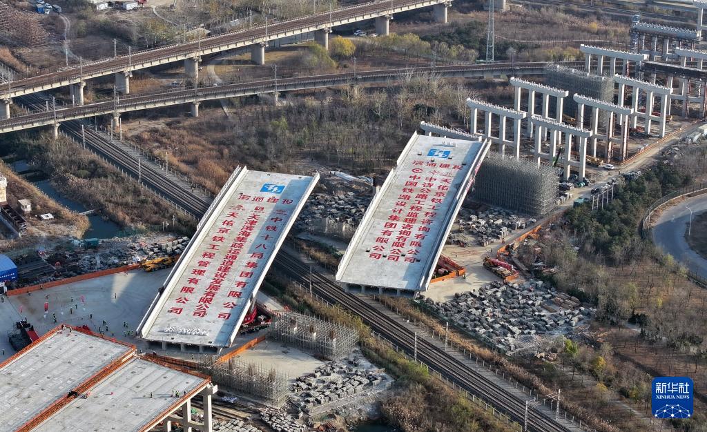 11月26日拍攝的興港高速上跨津山鐵路轉(zhuǎn)體橋施工現(xiàn)場(無人機照片)。