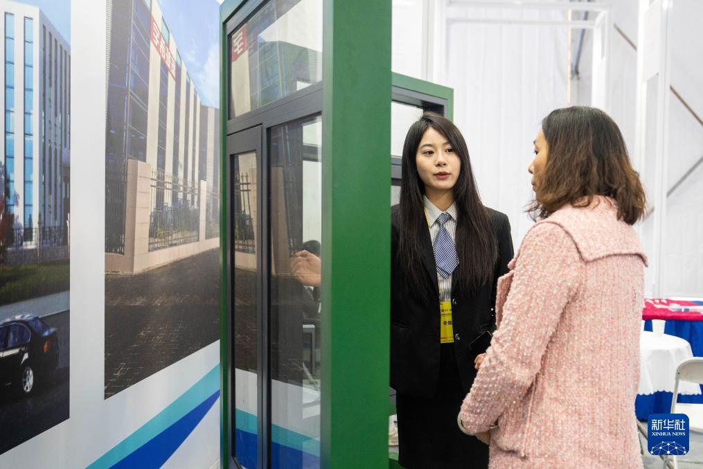 11月27日,在婁底經(jīng)開(kāi)區(qū)電力科技谷,參展商(左)在介紹復(fù)合材料門窗。