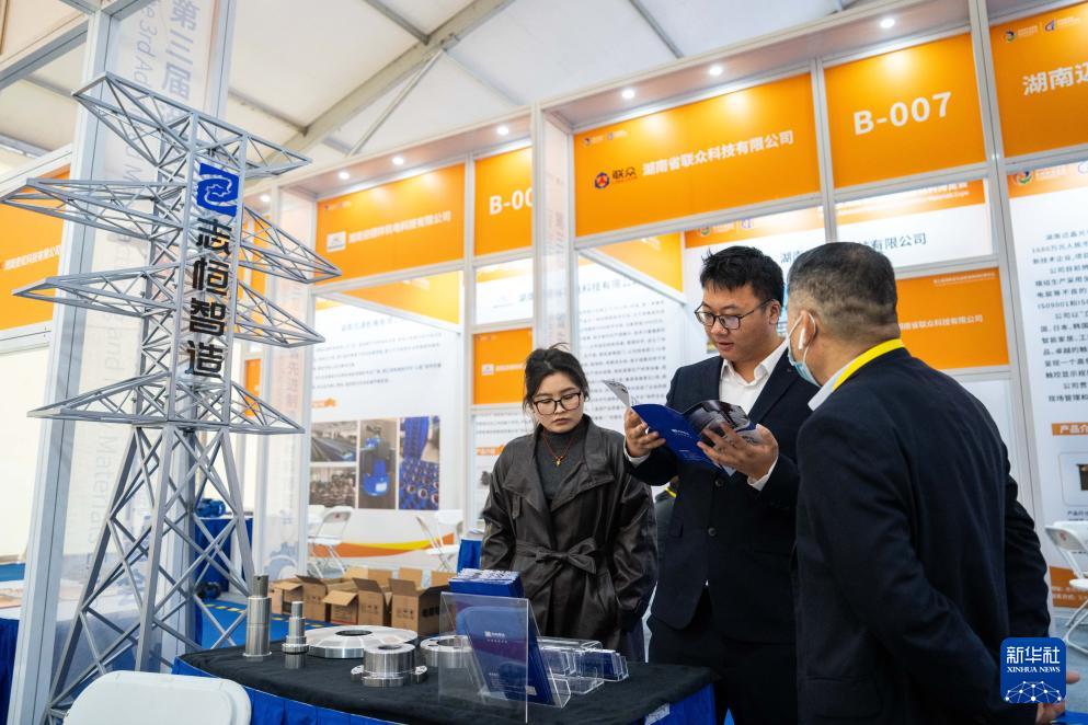 11月27日,在婁底經(jīng)開(kāi)區(qū)電力科技谷,參觀者(右一)在了解高強(qiáng)度緊固件產(chǎn)品。