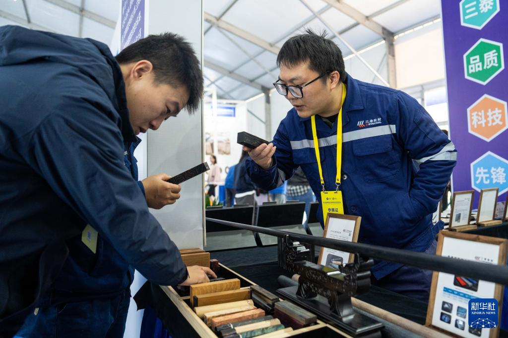 11月27日,在婁底經(jīng)開(kāi)區(qū)電力科技谷,參展商(右)在介紹木基復(fù)合材料。