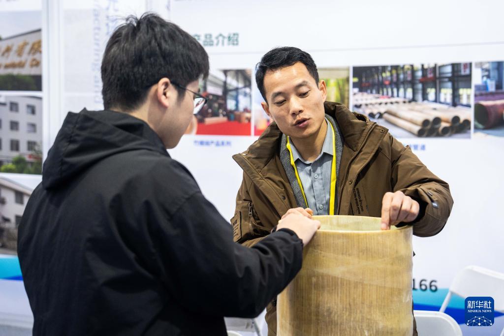 11月27日,在婁底經(jīng)開(kāi)區(qū)電力科技谷,參展商(右)在介紹竹纏繞復(fù)合材料。
