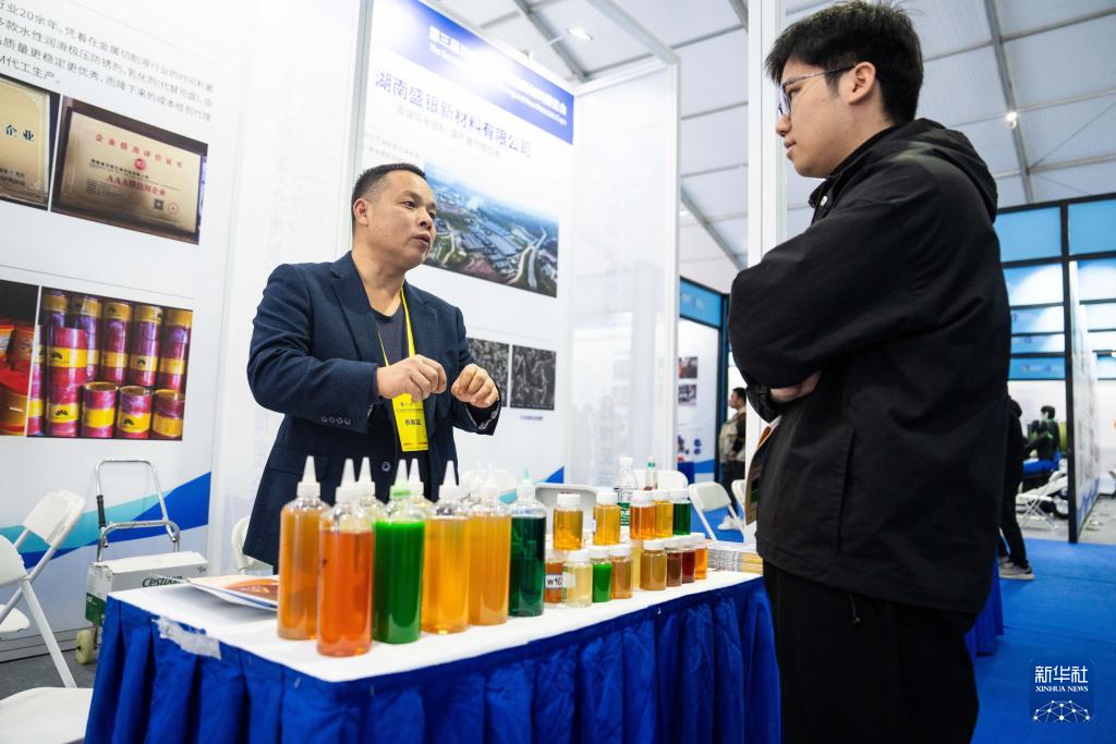 11月27日,在婁底經(jīng)開(kāi)區(qū)電力科技谷,參展商(左)在介紹金屬切削液。