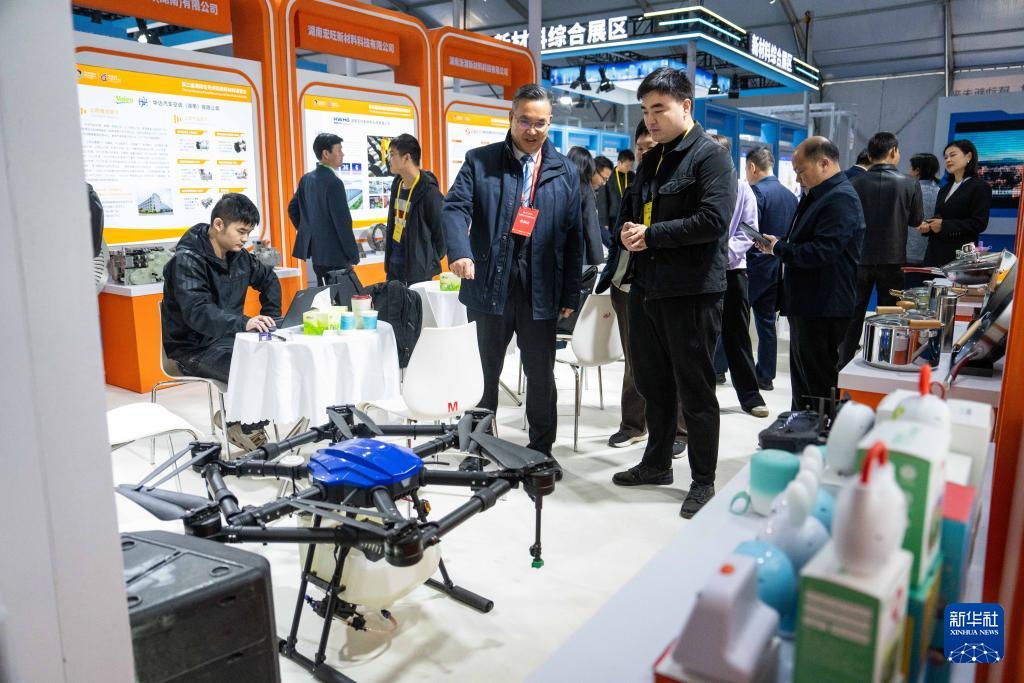 11月27日,在婁底經(jīng)開(kāi)區(qū)電力科技谷,參觀者(中)在了解一款農(nóng)用無(wú)人機(jī)。