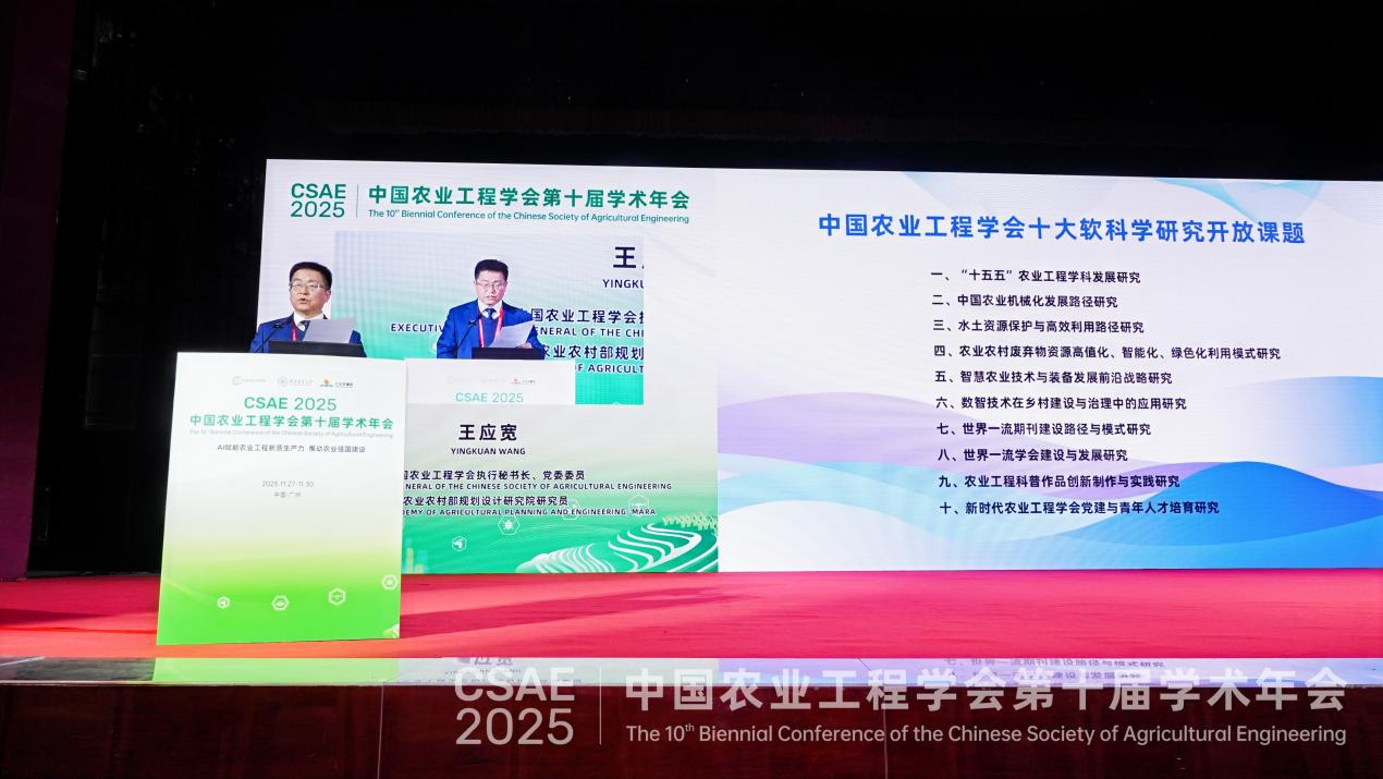 開幕式上,中國農(nóng)業(yè)工程學(xué)會名譽(yù)理事長、中國工程院院士、沈陽農(nóng)業(yè)大學(xué)教授李天來發(fā)布了“面向‘十五五’農(nóng)業(yè)工程領(lǐng)域十大前沿科技熱點問題”,中國農(nóng)業(yè)工程學(xué)會執(zhí)行秘書長王應(yīng)寬研究員發(fā)布了學(xué)會“十大軟科學(xué)自主研發(fā)課題”。隨后,還舉行了中國農(nóng)業(yè)工程學(xué)會科普志愿服務(wù)分隊授旗儀式。