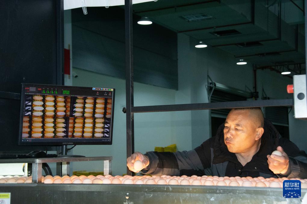 11月28日,在冷水灘區(qū)一雞蛋分揀中心,工作人員在人工檢測雞蛋。