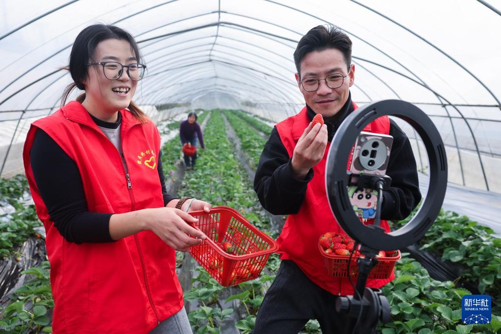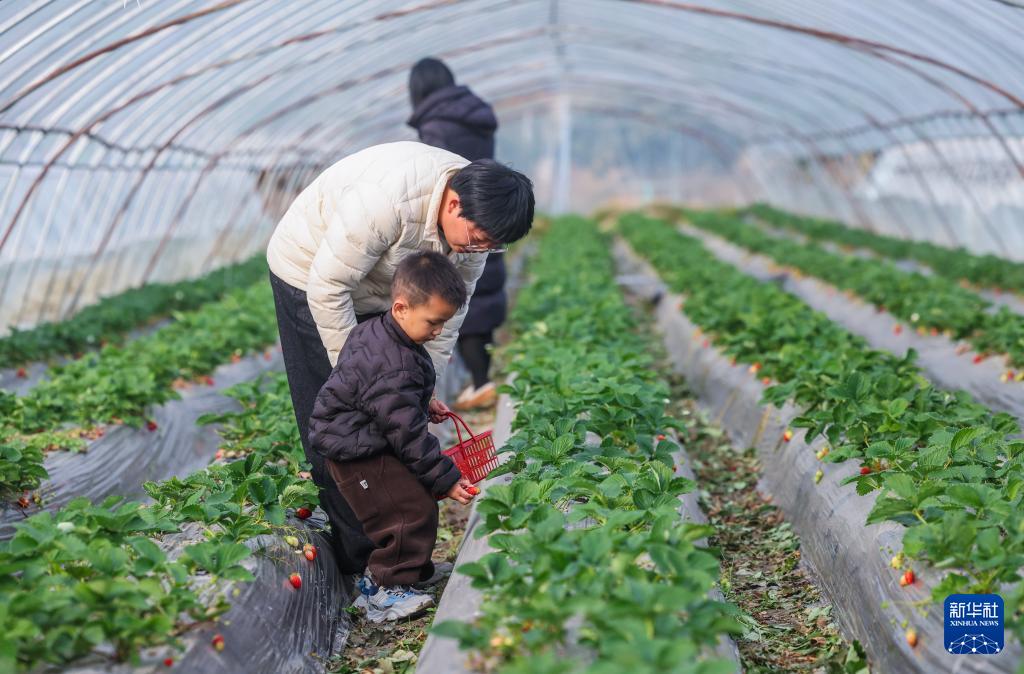 12月4日,游客在長興縣和平鎮(zhèn)便民橋村蜜甜家庭農(nóng)場大棚內(nèi)采摘草莓。