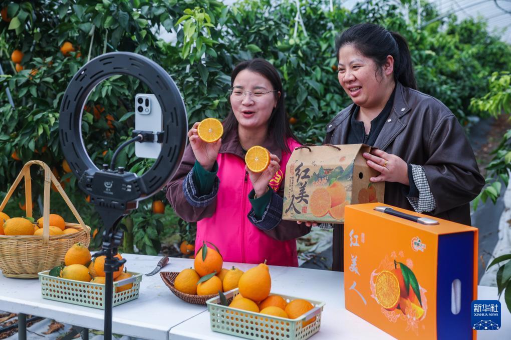 12月4日,在長興縣和平鎮(zhèn)東山村四季鮮果家庭農(nóng)場,當(dāng)?shù)厍嗄曛驹刚邽檗r(nóng)戶直播帶貨紅美人柑橘。