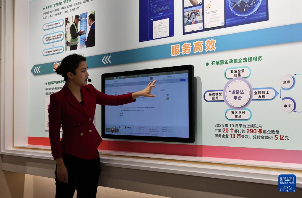 12月6日,講解員在觸控屏幕前為參觀者介紹上海一網(wǎng)通辦“浦易達(dá)”平臺的功能。