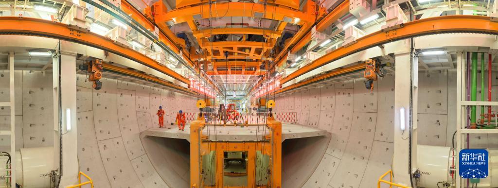 12月7日,施工人員在海太長(zhǎng)江隧道工程施工現(xiàn)場(chǎng)拼裝管片。