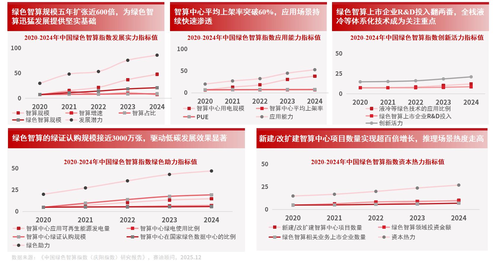 從細分指標來看,五年間,中國綠色智算產(chǎn)業(yè)多項指標實現(xiàn)高速發(fā)展,展現(xiàn)出強勁的增長動能和巨大的未來潛力。五年來,綠色智算規(guī)模、智算中心項目數(shù)量分別激增近600倍與100倍,助力發(fā)展實力、資本熱力指標表現(xiàn)突出。綠證認購規(guī)模逼近3000萬張大關,綠色智算上市企業(yè)R&D投入翻兩番,分別指向綠色助力與創(chuàng)新活力的澎湃活力。智算中心平均上架率突破60%,應用場景持續(xù)快速滲透,表明應用能力持續(xù)向好,未來空間廣闊,潛力巨大。
