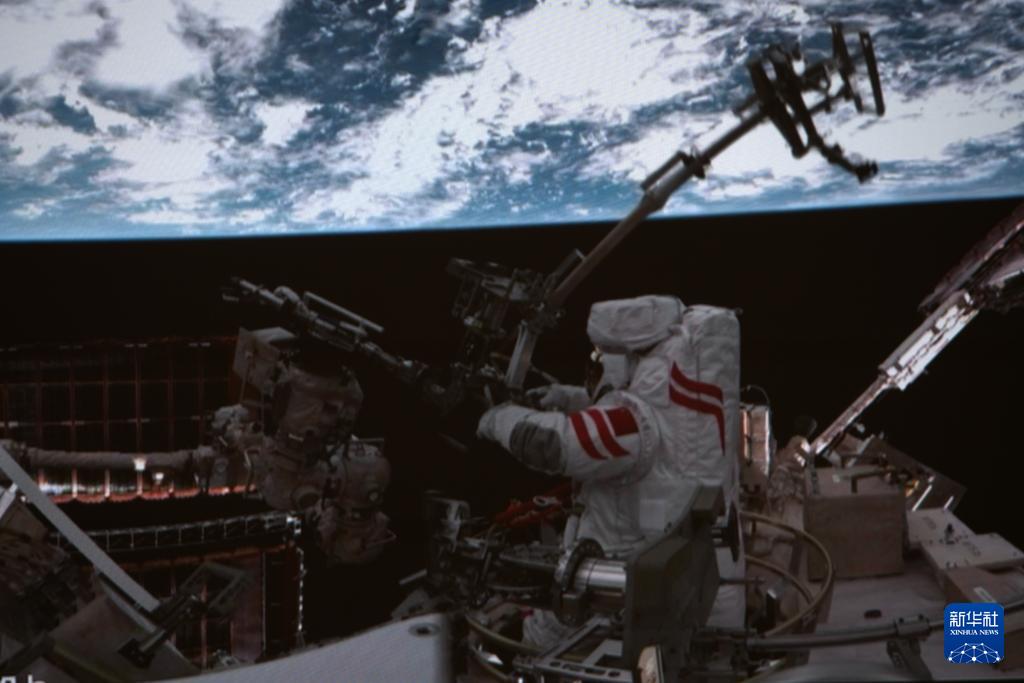 這是12月9日在北京航天飛行控制中心屏幕上拍攝的神舟二十一號乘組航天員張陸與武飛(右)在艙外工作的畫面。