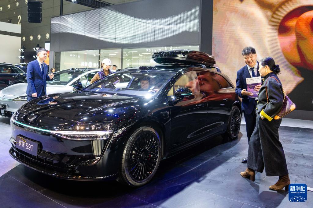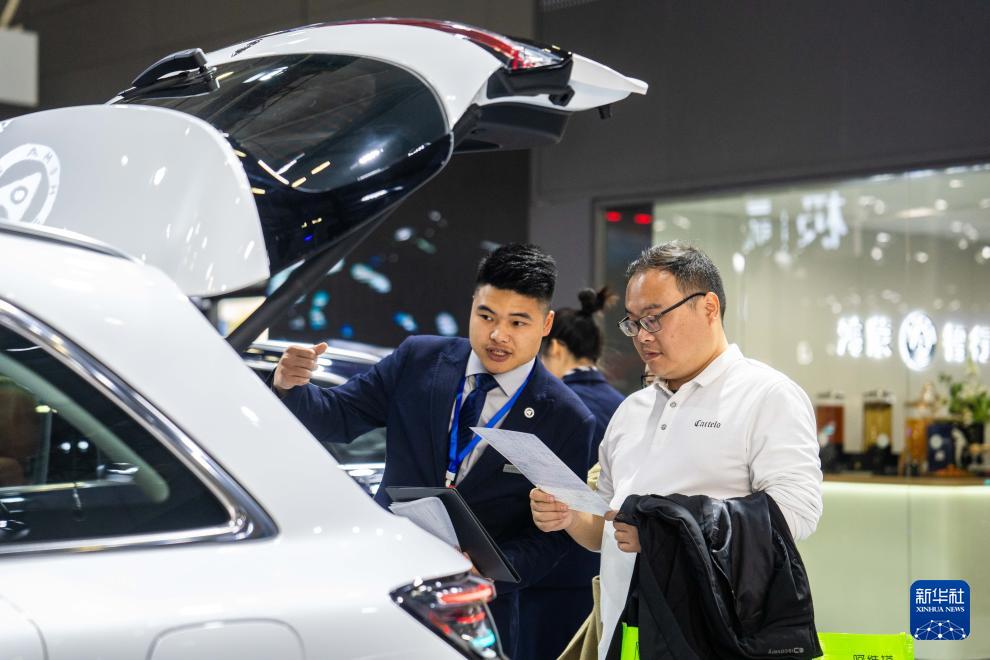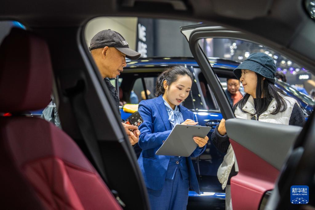 12月10日,在長(zhǎng)沙國(guó)際會(huì)展中心,工作人員(左)在介紹參展車輛。
