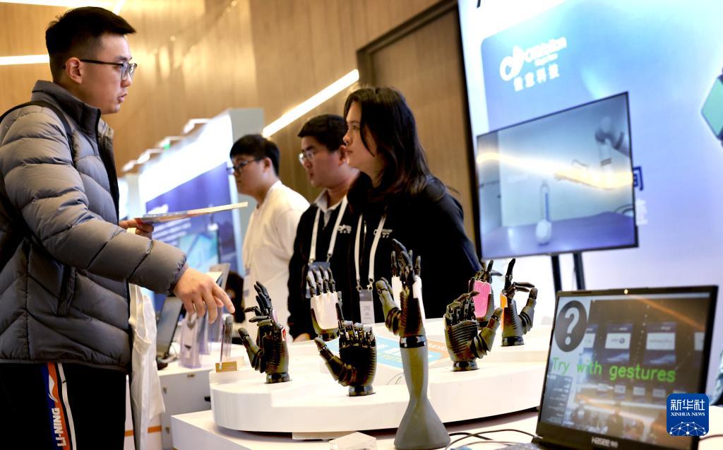 12月12日,參觀者在可穿戴機(jī)器外骨骼展品前交流討論。