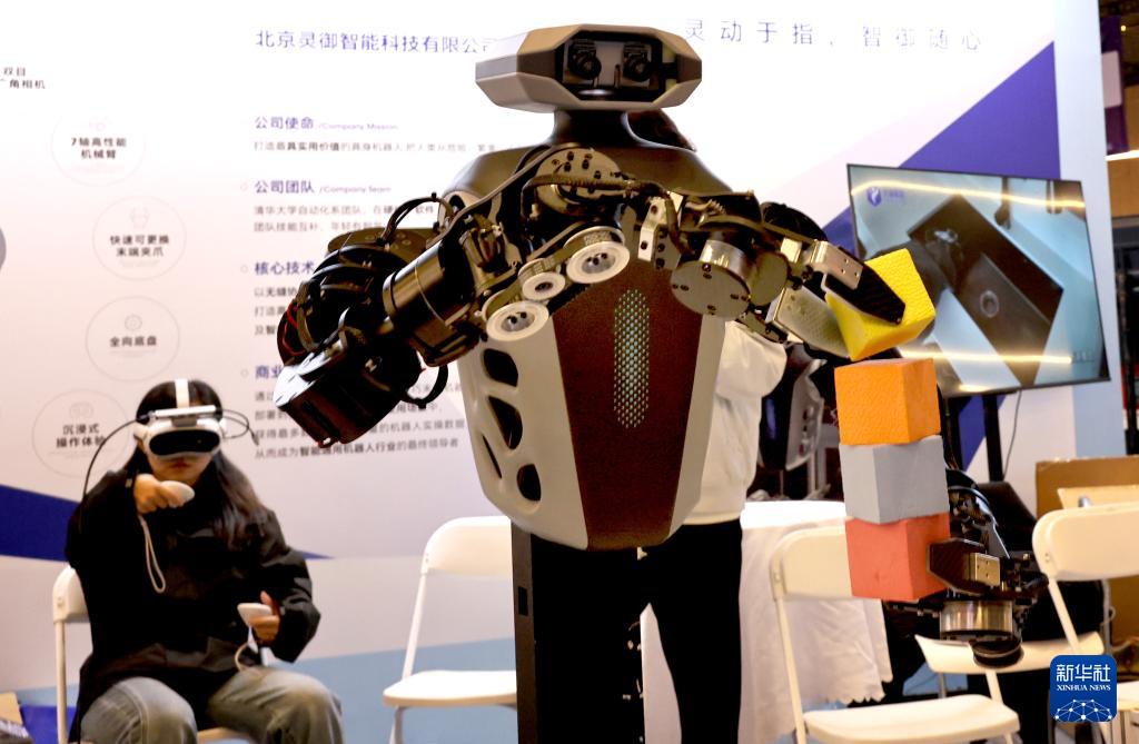 12月12日,工作人員(后)與機(jī)器人配合進(jìn)行懸空搭積木演示。