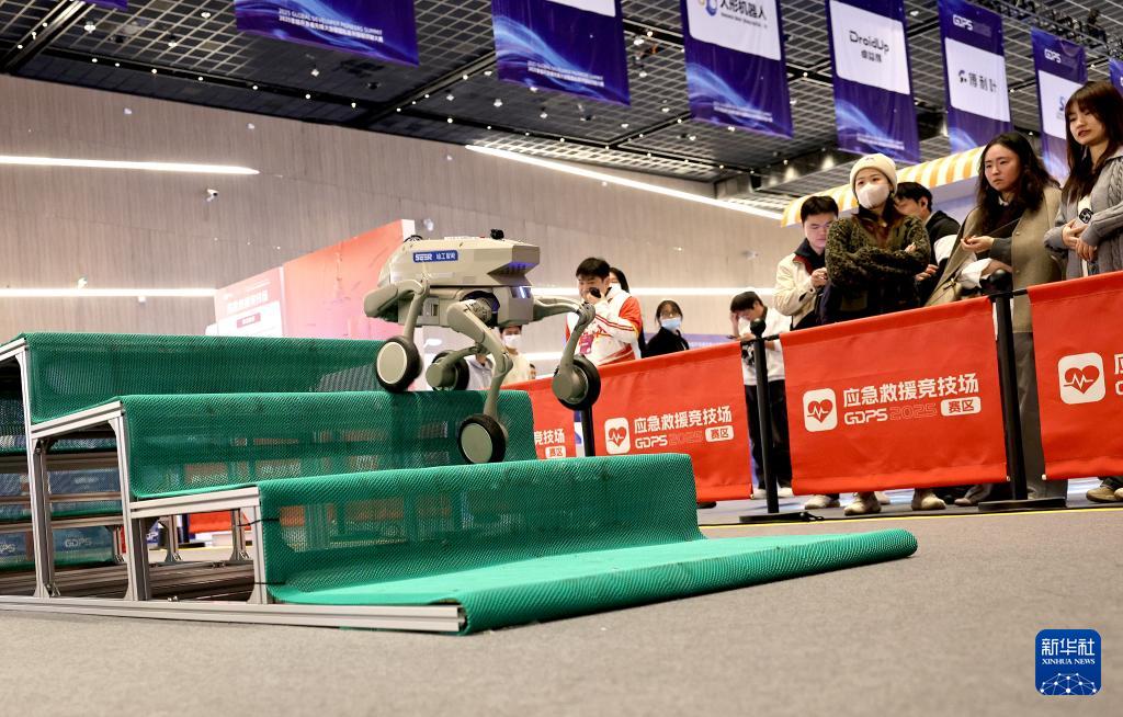 12月12日,輪式機(jī)器人在應(yīng)急救援競(jìng)技場(chǎng)演示快速爬樓梯技能。