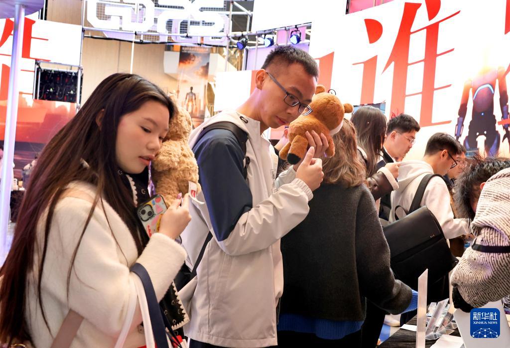 12月12日,參觀者在AI智能陪伴機(jī)器人展位前體驗(yàn)產(chǎn)品互動(dòng)功能。