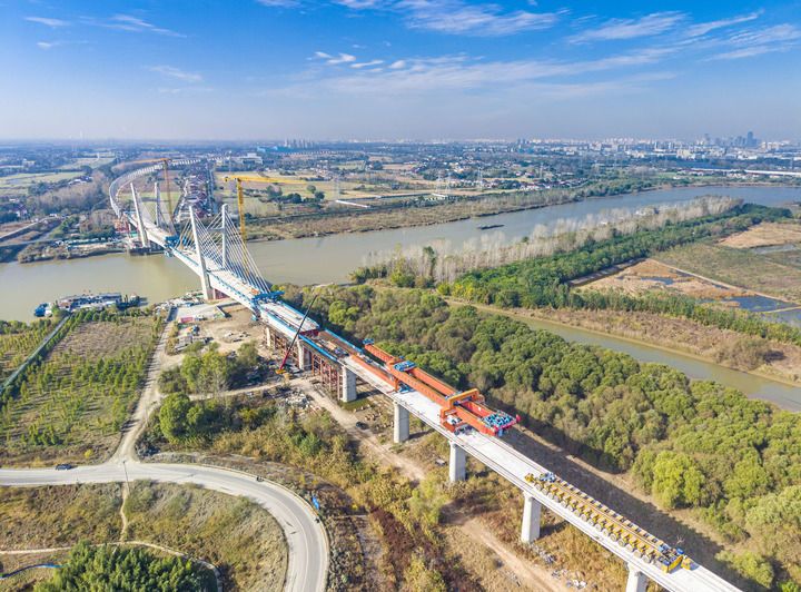 2025年11月20日,中鐵建大橋局施工機(jī)械在滬渝蓉高鐵江都段最后一榀箱梁架設(shè)現(xiàn)場作業(yè)(無人機(jī)照片)。新華社發(fā)(任飛攝)