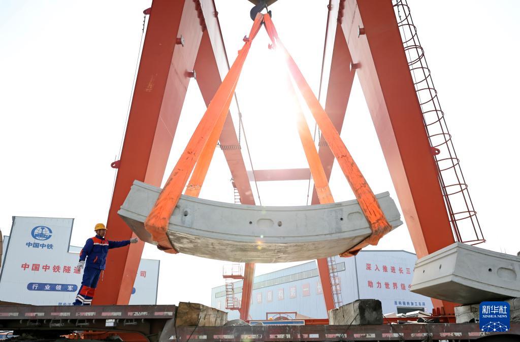 12月16日,工人在“領航號”盾構機內操作吊裝隧道管片。