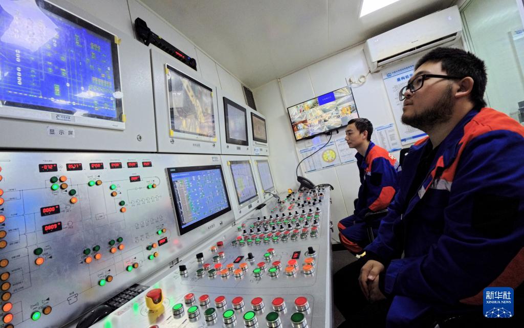12月16日,工人在“領航號”盾構機控制室內監(jiān)看掘進運行數(shù)據(jù)。
