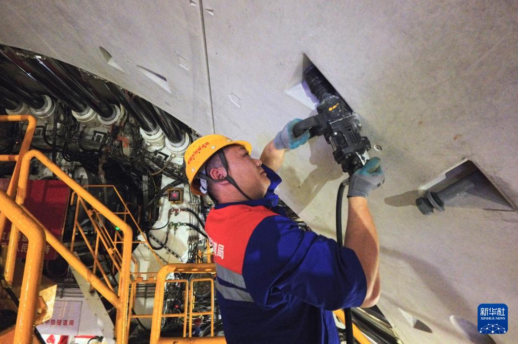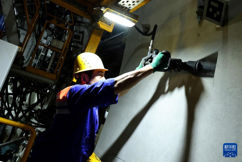 12月16日,工人在“領航號”盾構機上進行管片螺栓緊固工作。