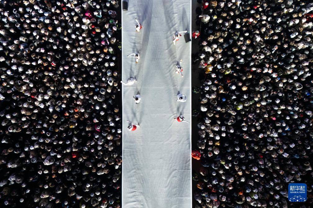 12月17日,游客在哈爾濱冰雪大世界園區(qū)體驗“超級冰滑梯”(無人機照片)。