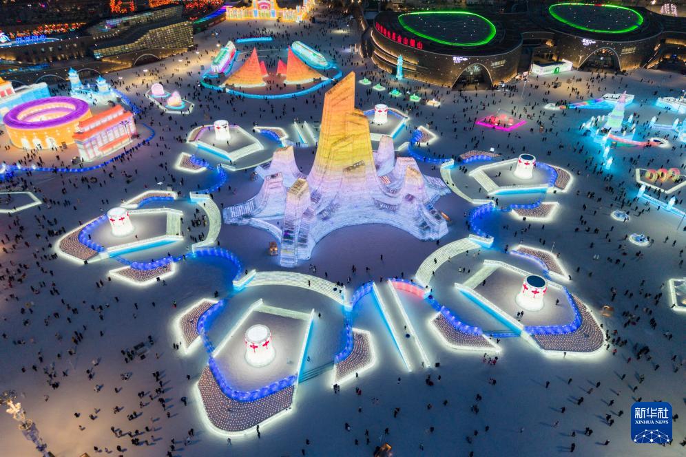 12月17日,游客在哈爾濱冰雪大世界園區(qū)游玩(無人機照片)。