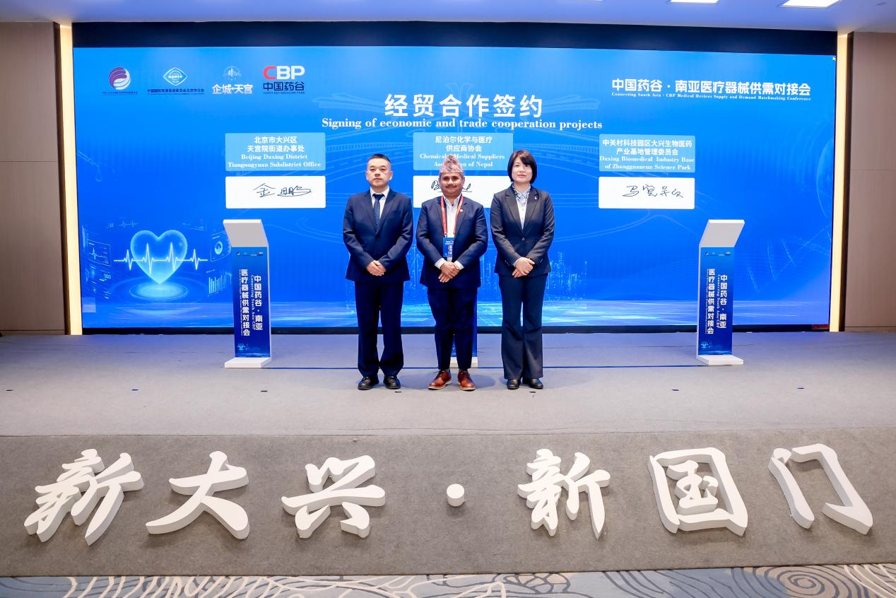 簽約環(huán)節(jié)成果顯著,構(gòu)建了從市場需求到產(chǎn)業(yè)落地的高效閉環(huán)。尼泊爾化學與醫(yī)療供應商協(xié)會、中關(guān)村科技園區(qū)大興生物醫(yī)藥產(chǎn)業(yè)基地管委會、大興區(qū)天宮院街道辦事處(京南物流基地管委會)三方共同簽署《經(jīng)貿(mào)合作協(xié)議》。該協(xié)議創(chuàng)新性地整合了南亞市場資源、中國藥谷產(chǎn)業(yè)資源與屬地化精準服務支撐,致力于建立三方長期穩(wěn)定的戰(zhàn)略合作機制,推動優(yōu)質(zhì)醫(yī)療器械產(chǎn)品、前沿技術(shù)和專業(yè)服務系統(tǒng)性、規(guī)模化進入南亞市場。