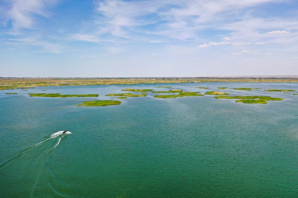 6月5日,在巴彥淖爾市磴口縣奈倫湖國(guó)家濕地公園,摩托艇行駛在湖面上(無(wú)人機(jī)照片)。黃河“幾字彎”逐漸展現(xiàn)“金沙藍(lán)海綠洲”的美麗畫卷。新華社記者 李志鵬 攝