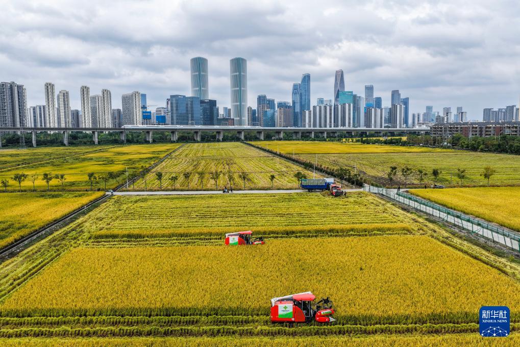 10月21日,在浙江杭州蕭山區(qū),收割機在稻田里收割水稻,遠處高鐵列車飛馳而過(無人機照片)。