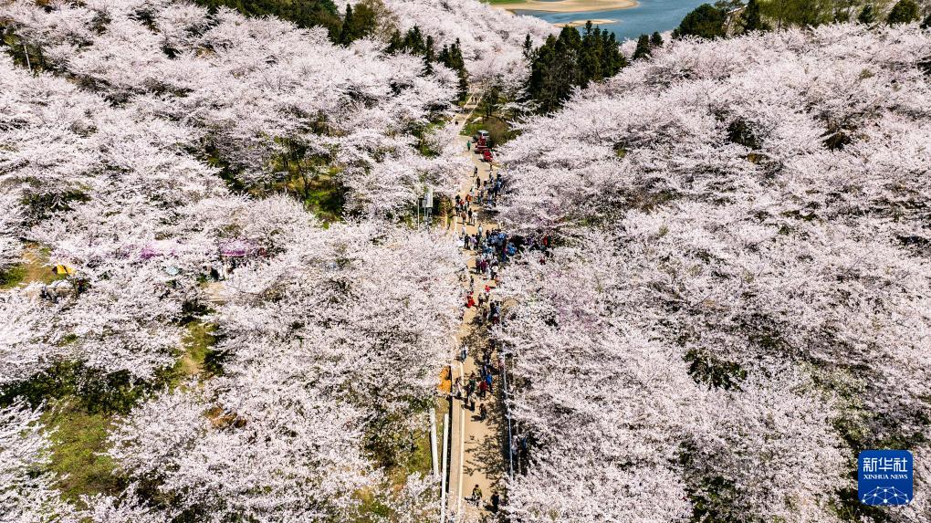 3月26日,游客在貴州省貴安新區(qū)櫻花園內(nèi)賞花游玩(無人機照片)。