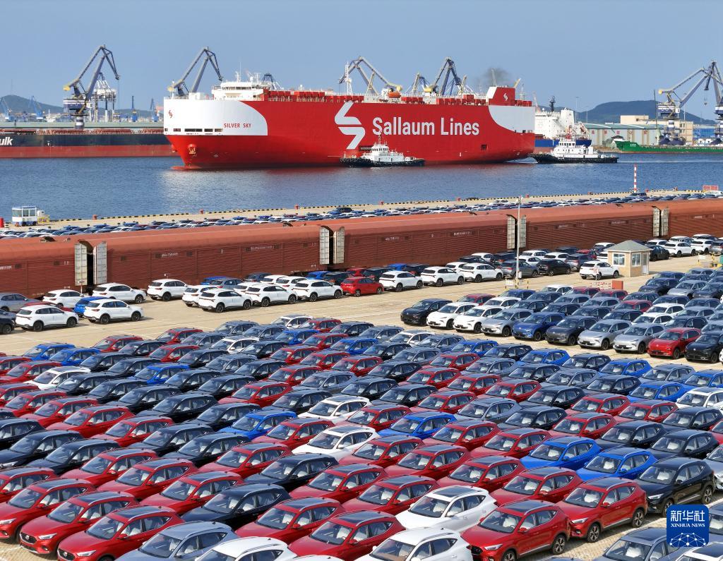 9月14日,國產(chǎn)汽車在山東港口煙臺港集結(jié)等待裝船出口(無人機照片)。