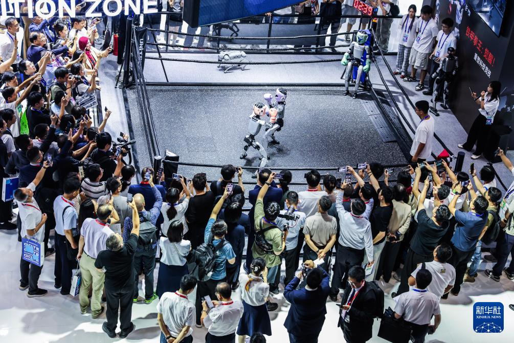 9月25日,在第四屆全球數(shù)字貿(mào)易博覽會數(shù)智未來主題展區(qū)的杭州六小龍專區(qū),觀眾觀看宇樹科技的人形機器人進行格斗擂臺賽。