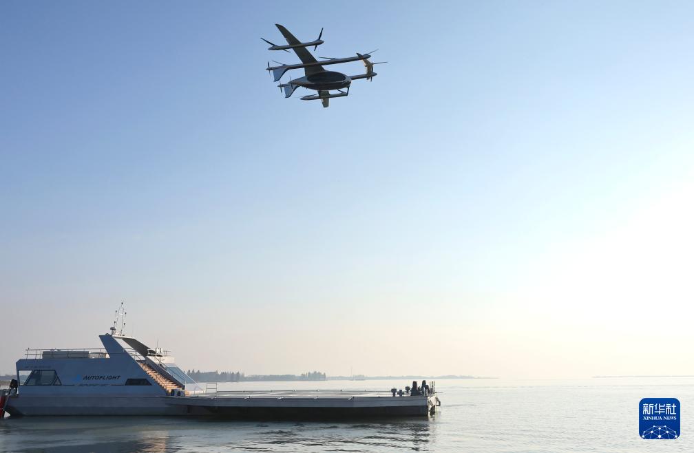 11月22日,在江蘇昆山的峰飛航空全球科技日活動中,一架電動垂直起降飛行器從“水上機場”起飛。