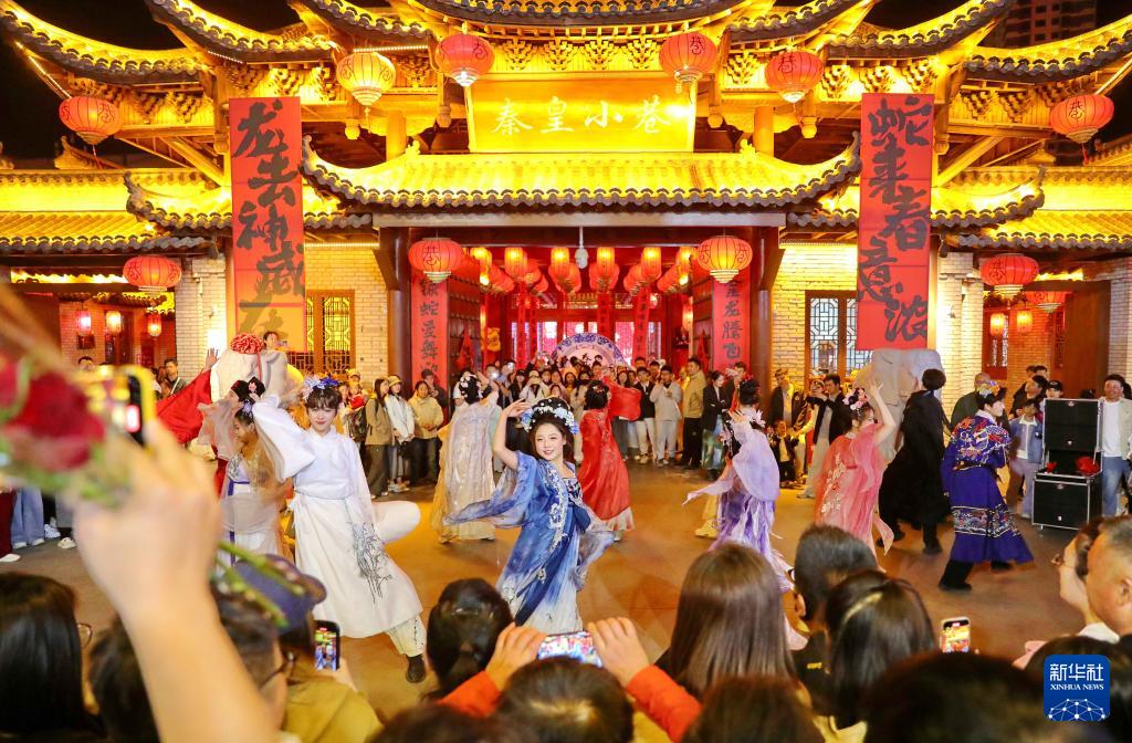 5月3日,游客在河北省秦皇島市海港區(qū)秦皇小巷觀看舞蹈演出。