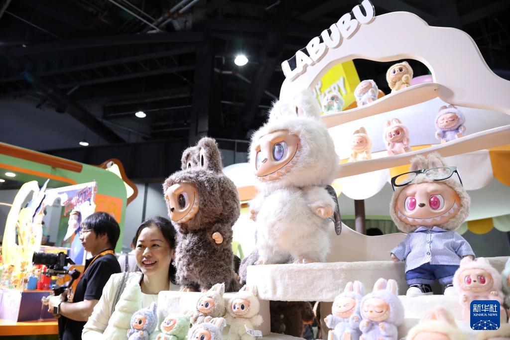 9月10日,在2025年服貿(mào)會上,參會人員在泡泡瑪特展臺與LABUBU玩偶合影。