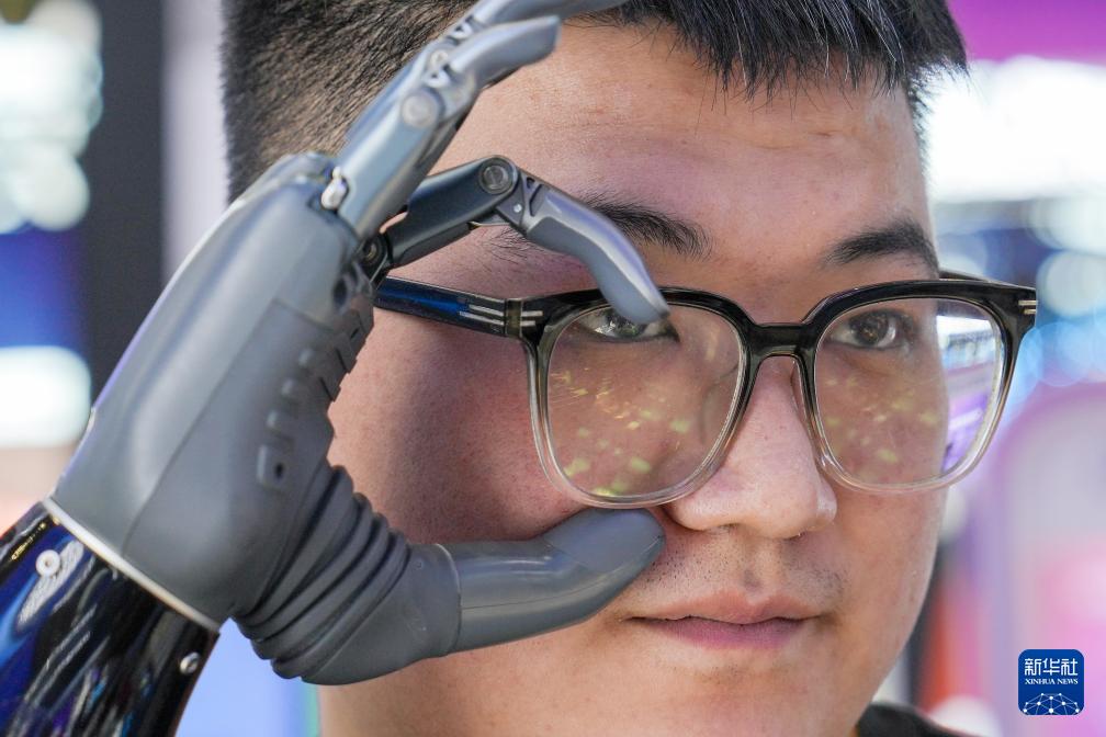 7月17日,在第三屆中國國際供應鏈促進博覽會數(shù)字科技鏈展區(qū),一名右手殘疾的工作人員佩戴智能仿生手后摘取眼鏡。