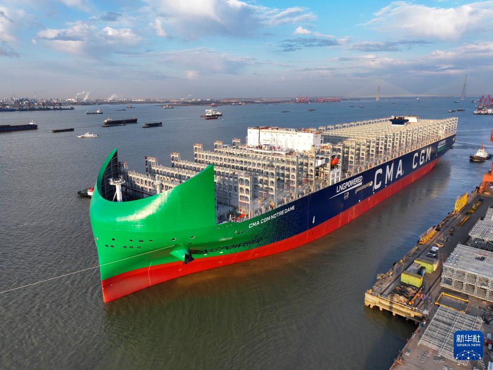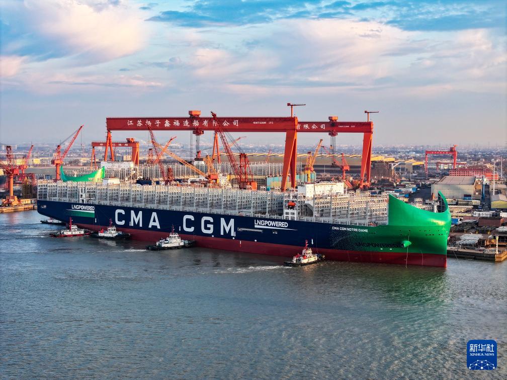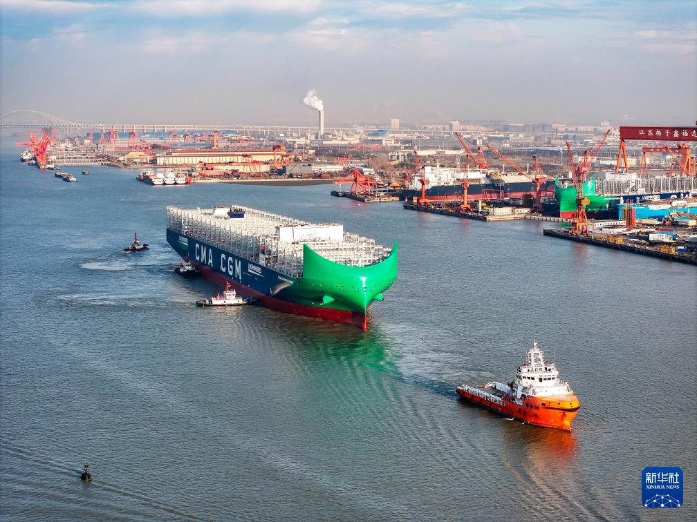 12月27日,超大型雙燃料集裝箱船“鑫福136”輪在拖輪的牽引下離開江蘇揚子鑫福造船有限公司舾裝碼頭(無人機照片)。