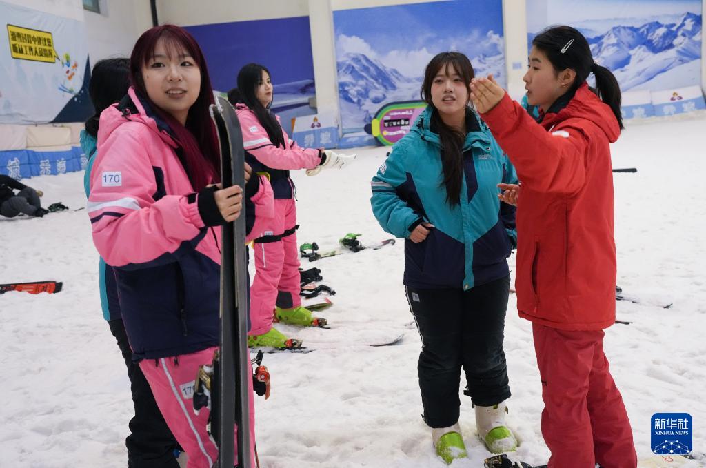 教練(右一)在紹興喬波冰雪世界向初學(xué)者介紹雪場情況(12月24日攝)。