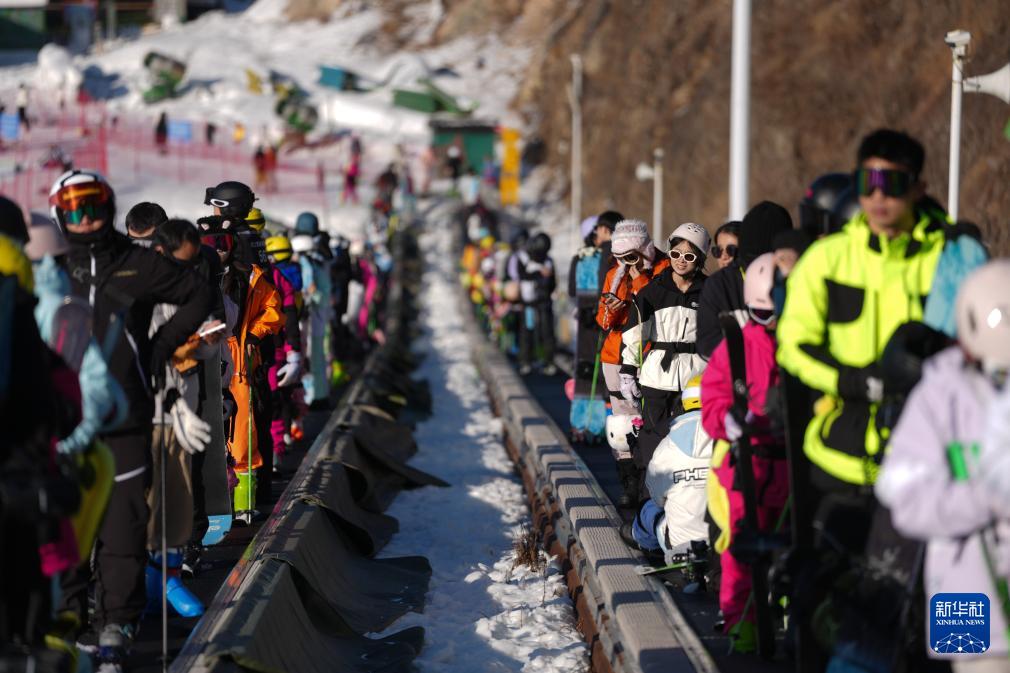 游客在湖州安吉云上草原滑雪場有序乘坐魔毯(12月28日攝)。