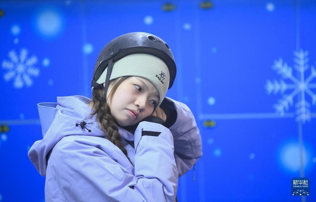 一名女子在紹興喬波冰雪世界戴頭盔準備進入雪場(12月24日攝)。