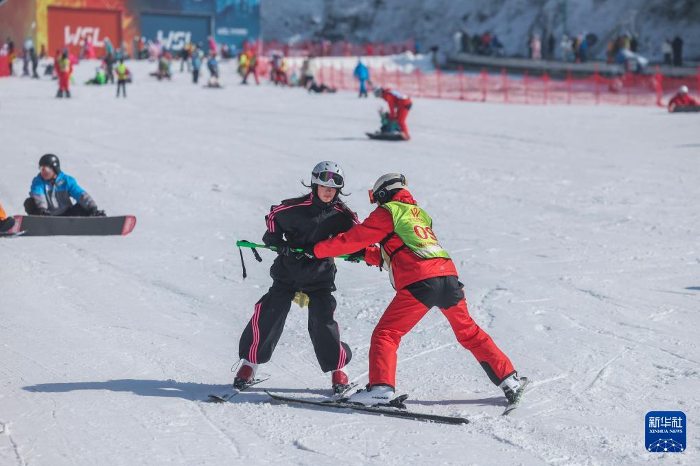 12月25日,杭州臨安大明山萬松嶺滑雪場的教練在指導(dǎo)游客。