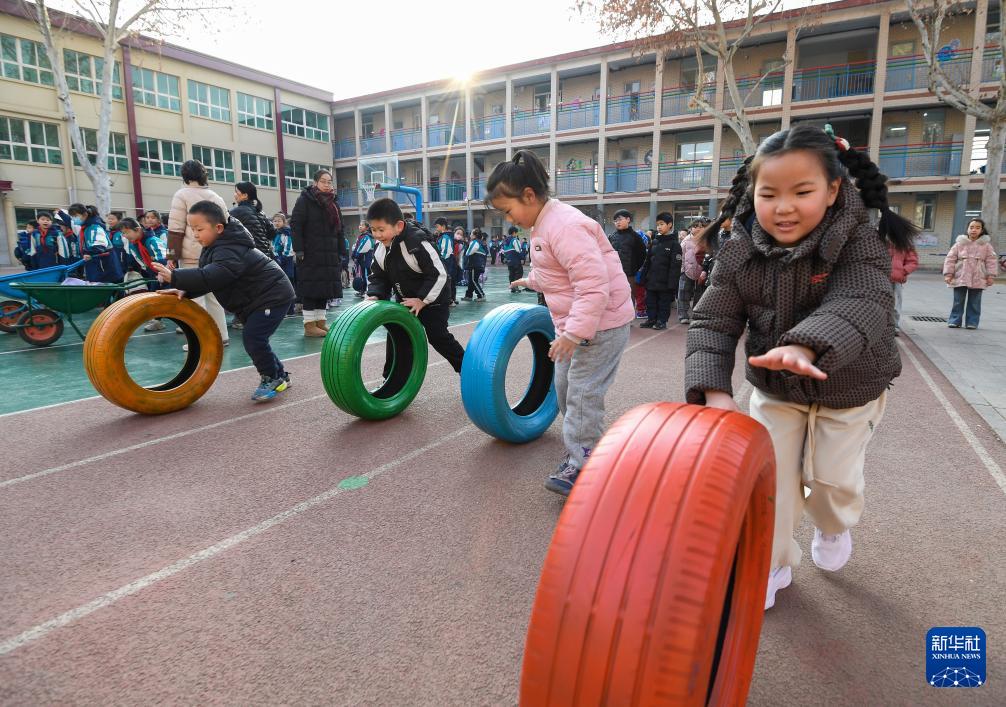 12月30日,在河北省石家莊市西里小學(xué),學(xué)生進(jìn)行滾輪胎比賽迎新年。