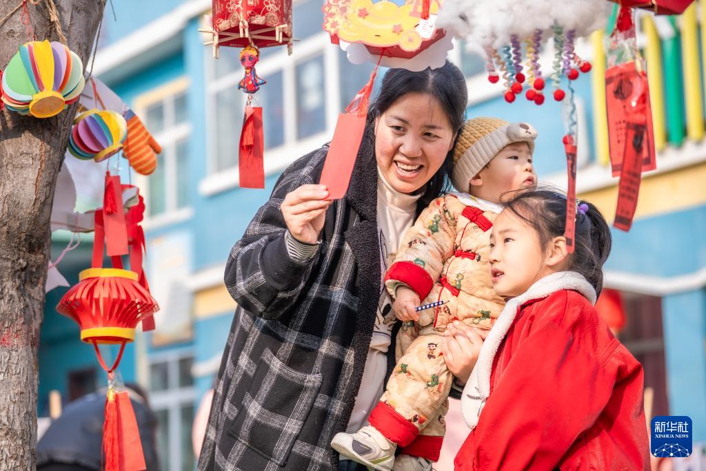 12月30日,在河南省駐馬店市西平縣一所幼兒園的元旦親子游園廟會(huì)上,小朋友和家人一同參與猜燈謎游戲。