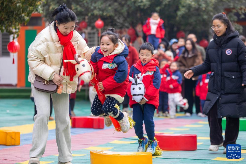 12月30日,學(xué)生在湖北省襄陽(yáng)市樊城區(qū)第五幼兒園開(kāi)展的迎新年親子活動(dòng)中進(jìn)行趣味游戲。